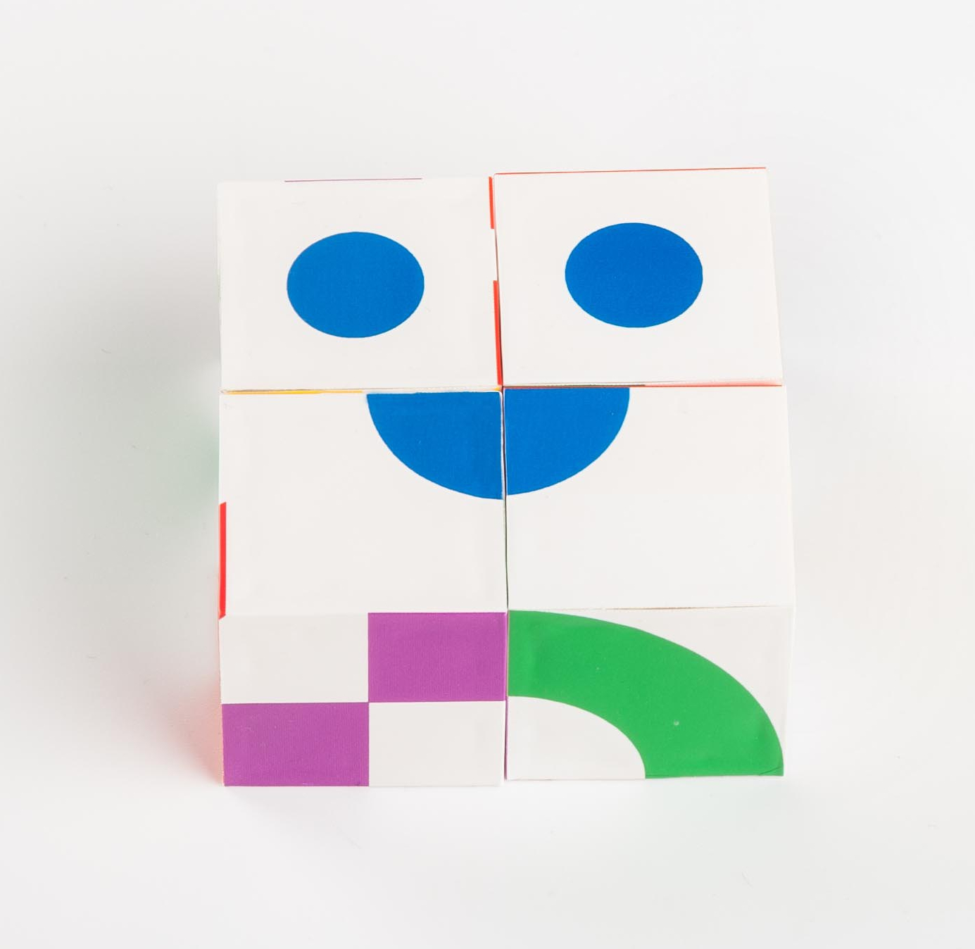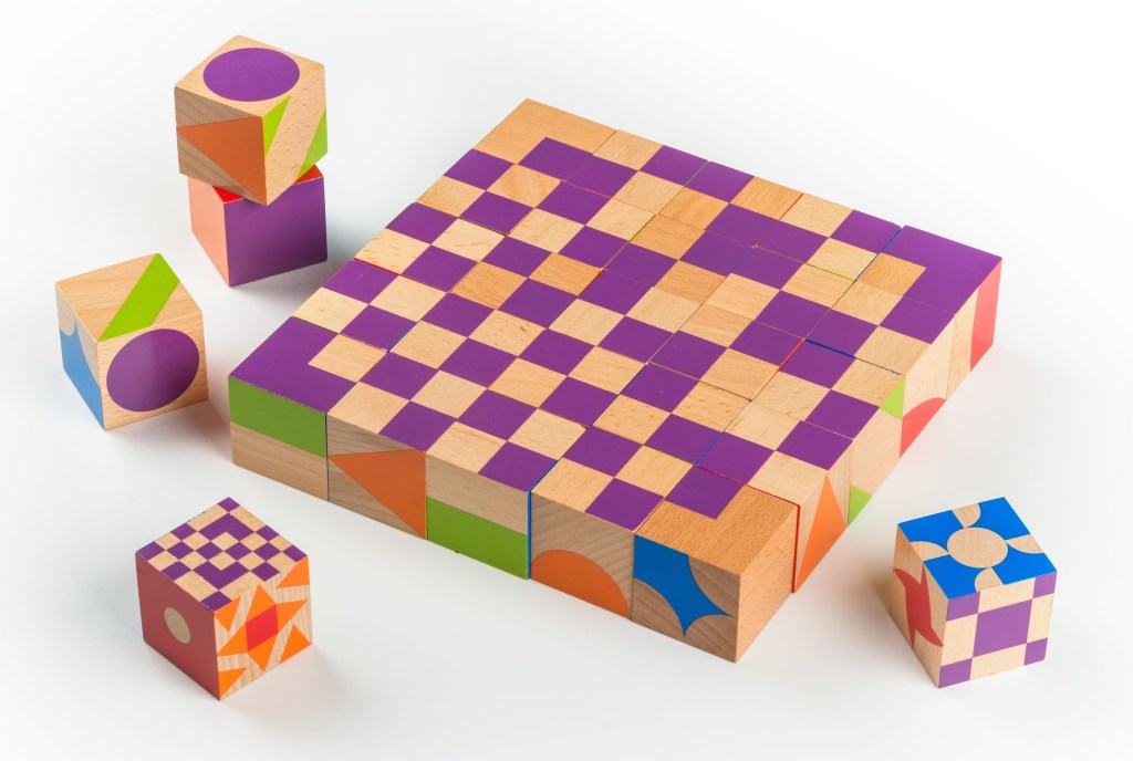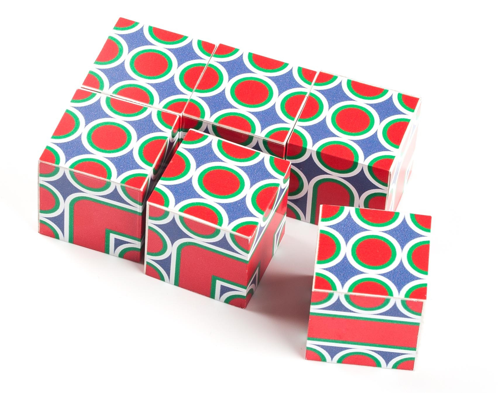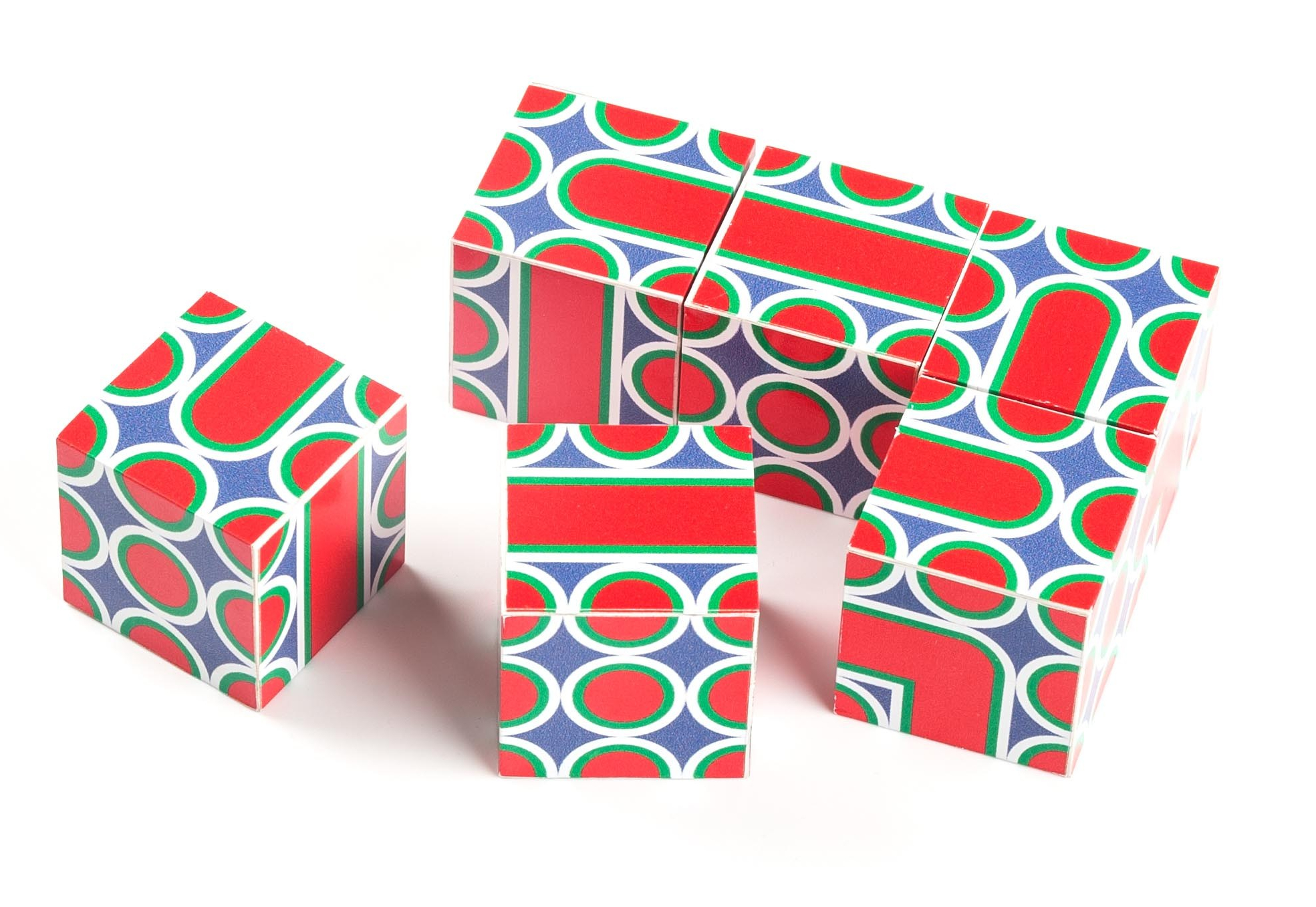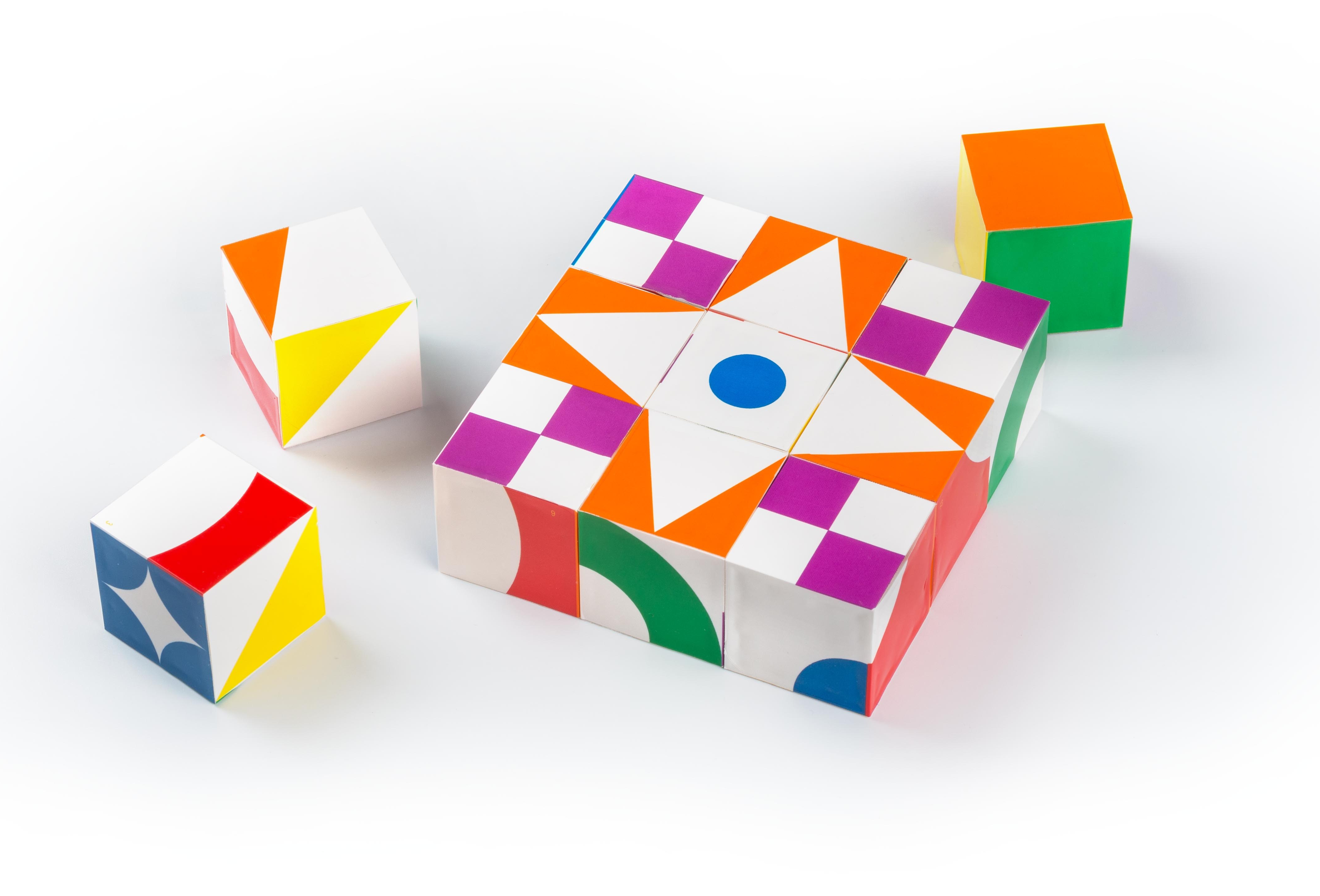 What struck me immediately was that whereas a six-picture cube puzzle is limited to six pictures, the geometric shapes could make lots of patterns and pictures! Inspired by this idea I made her a new set using 27 cubes to include a 3D puzzle. I spent hours choosing the shapes and carefully distributing them among the cubes. And so MOZIBLOX (‘mosaic cubes’), with a seemingly infinite capacity for pattern and picture making, was born!